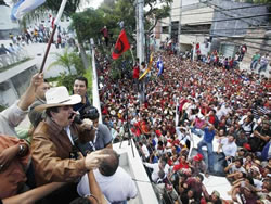 "¡Sí se pudo, sí se pudo!" y "fuera los golpistas", gritaba la muchedumbre frente a la embajada. "A partir de ahora nadie nos vuelve a sacar de aquí, por eso nuestra posición es patria, restitución o muerte", enfatizó Zelaya ante sus seguidores.